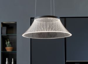 Estetska osvetlitev za LuceplanNa njem je jasen podpis Monice Armani: viseče svetilo Silenzio, ki ga je oblikovala za podjetje Luceplan. Svetilo združuje tekstilno estetiko z inovativnim učinkom absorpcije zvoka za prijetnejši ambient v prostoru. Oblikovalka ustvarja prav to prefinjeno povezavo tudi v svojih drugih arhitekturnih projektih, na primer v salonu za skupino Poltrona Frau.
