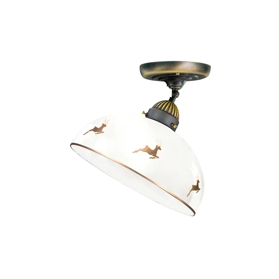 Stropna svetilka Nonna združuje rustikalni podeželski slog z visokokakovostnim rokodelstvom. Izdelana je iz plemenitega stekla in masivnega medenine, navdušuje pa z dekorativnim dizajnom senčnika. Vzorec z zlatimi jeleni je ročno naslikan. Gladki rob in filigranski detajli svetilki dajejo brezčasno eleganco, ki se popolnoma vklaplja v dnevno sobo, jedilnico ali hodnik.