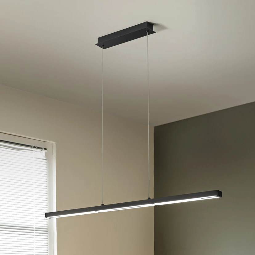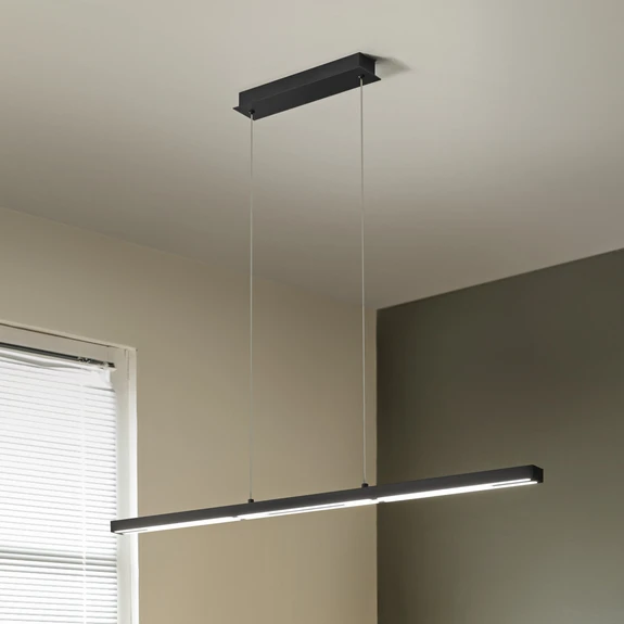 LED viseča svetilka z možnostjo zatemnitve Ling v obliki kvadratne cevi Ta viseča svetilka z obliko žarka in vgrajenim svetlobnim virom LED ponuja kombinacijo sloga in učinkovitosti, ki je odlična nad jedilno mizo. Sodoben slog se brezhibno zlije s sodobnimi koncepti notranje opreme ter ustvari vzdušje, ki je vabljivo in navdihujoče. Svetilo Ling je funkcionalno in modno, z eno svetilko za dvigovanje in eno svetilko za spuščanje. Te lahko preklapljate ločeno. Obesno svetilko je mogoče tudi neskončno zatemniti z gumbom na strani tankega senčila. Njene različne svetlobne odprtine ustvarjajo poseben videz in predvsem izjemen svetlobni učinek.