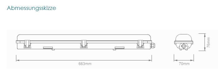 Svetilka je izdelana iz polikarbonata in ima zamenljivo stekleno cev T8 z 2A varovalko. Svetilka je pripravljena za priklop in primerna za takojšnjo uporabo. Na voljo je v dveh različnih velikostih.