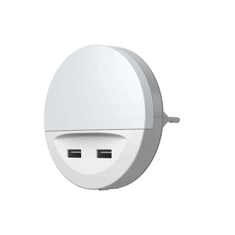 LUNETTA USB je nočna lučka za uporabo v 230 V vtičnicah, ki je opremljena tudi z USB-izhodom in možnostjo za odlaganje mobilnega telefona. Lastnosti izdelka: Micro-USB-vtičnica s funkcijo polnjenja. Integrirana možnost za odlaganje mobilnega telefona na zadnji strani. Integriran senzor za dan/noč. Prednosti izdelka: Samodejno vklapljanje in izklapljanje glede na dnevno svetlobo. Plug-and-play z EU vtičnico. Energetsko učinkovita zaradi LED tehnologije. Področja uporabe: Spalnica. Otroška soba. Samo za notranjo razsvetljavo.