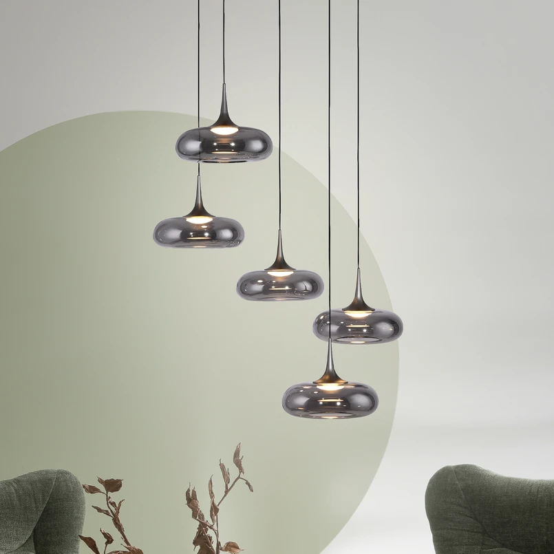 LED viseča svetilka Posh s petimi dimnimi steklenimi senčniki, nastavljiva višina